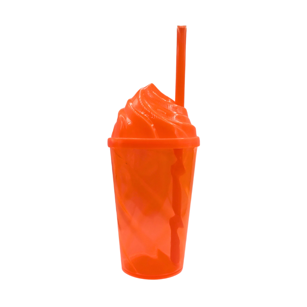 Design lúdico e moderno: Copo com corpo espiral (twister) e tampa no formato chantilly.